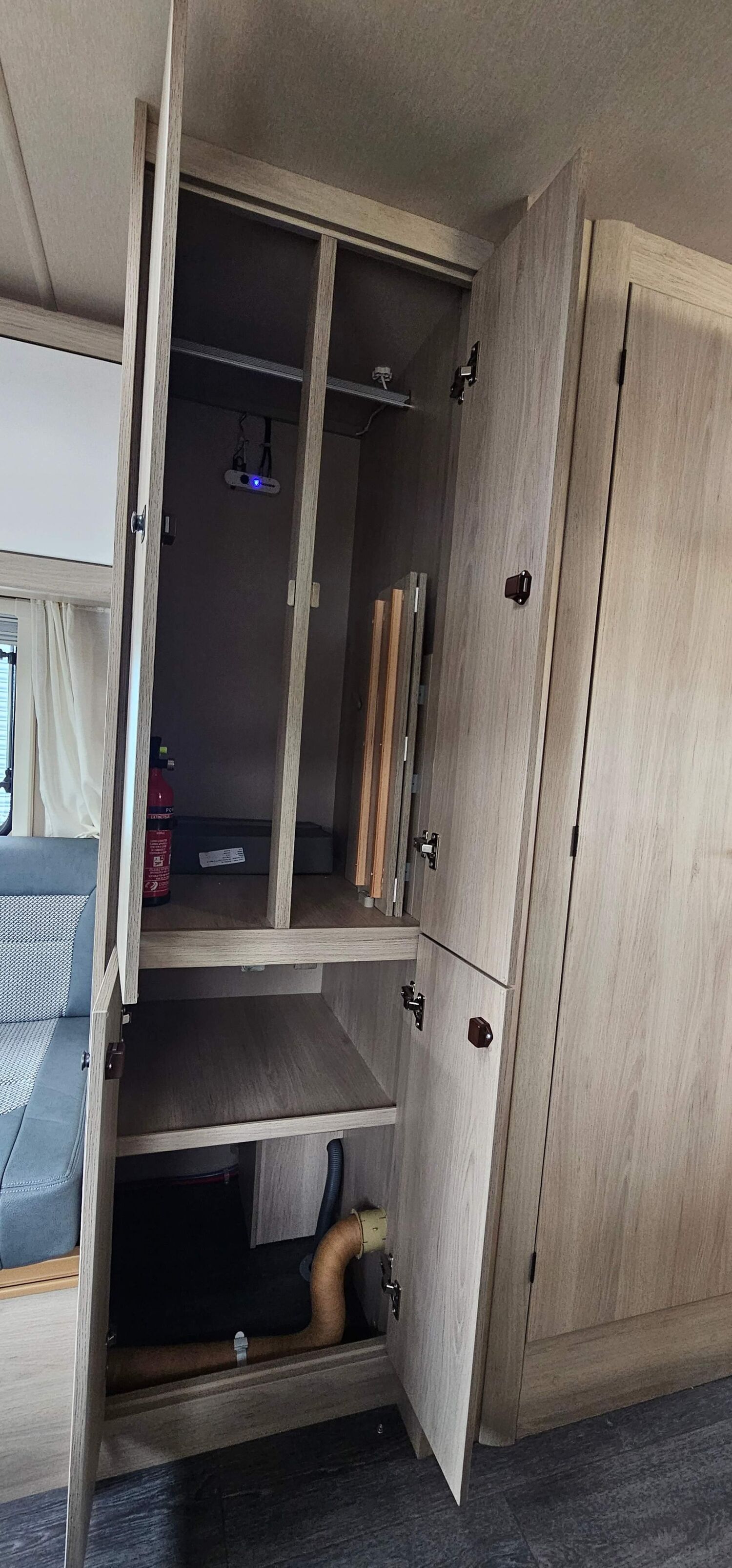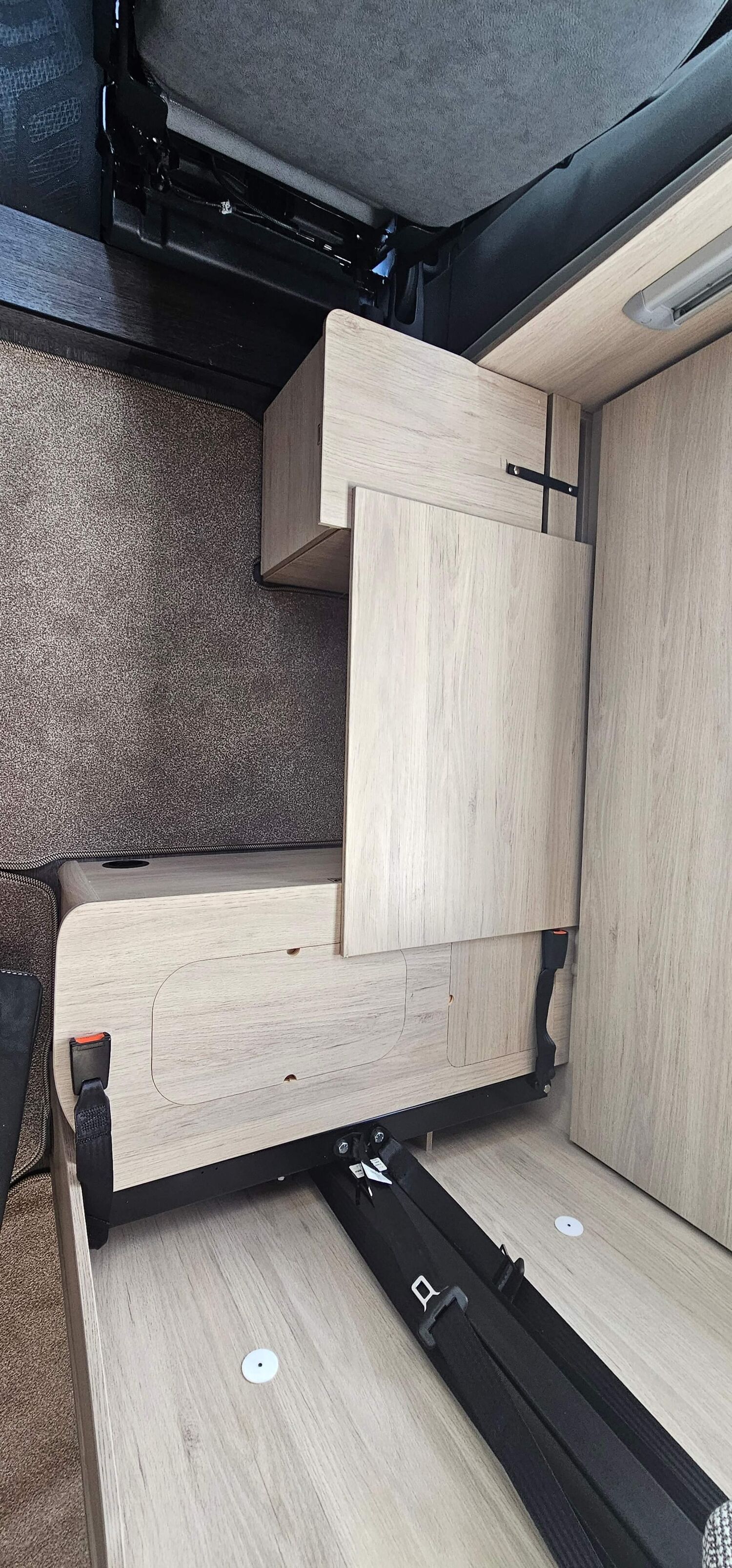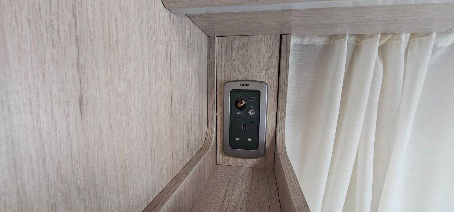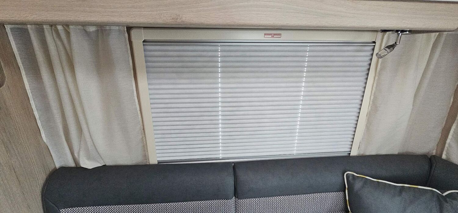 12V ELECTRIC FLUSH TOILET WITH REMOVABLE CASSETTE ON WHEELS, EASY ACCESS TO BED BOXES, SALINAS OAK SOLID PLYWOOD INTERIOR FURNITURE, WHITE / SALINAS OAK UPPER LOCKER DOORSWHITE / SALINAS OAK UPPER LOCKER DOORS, PLEATED FLYSCREENS/BLINDS TO ALL OPENING HABITATION WINDOWS,