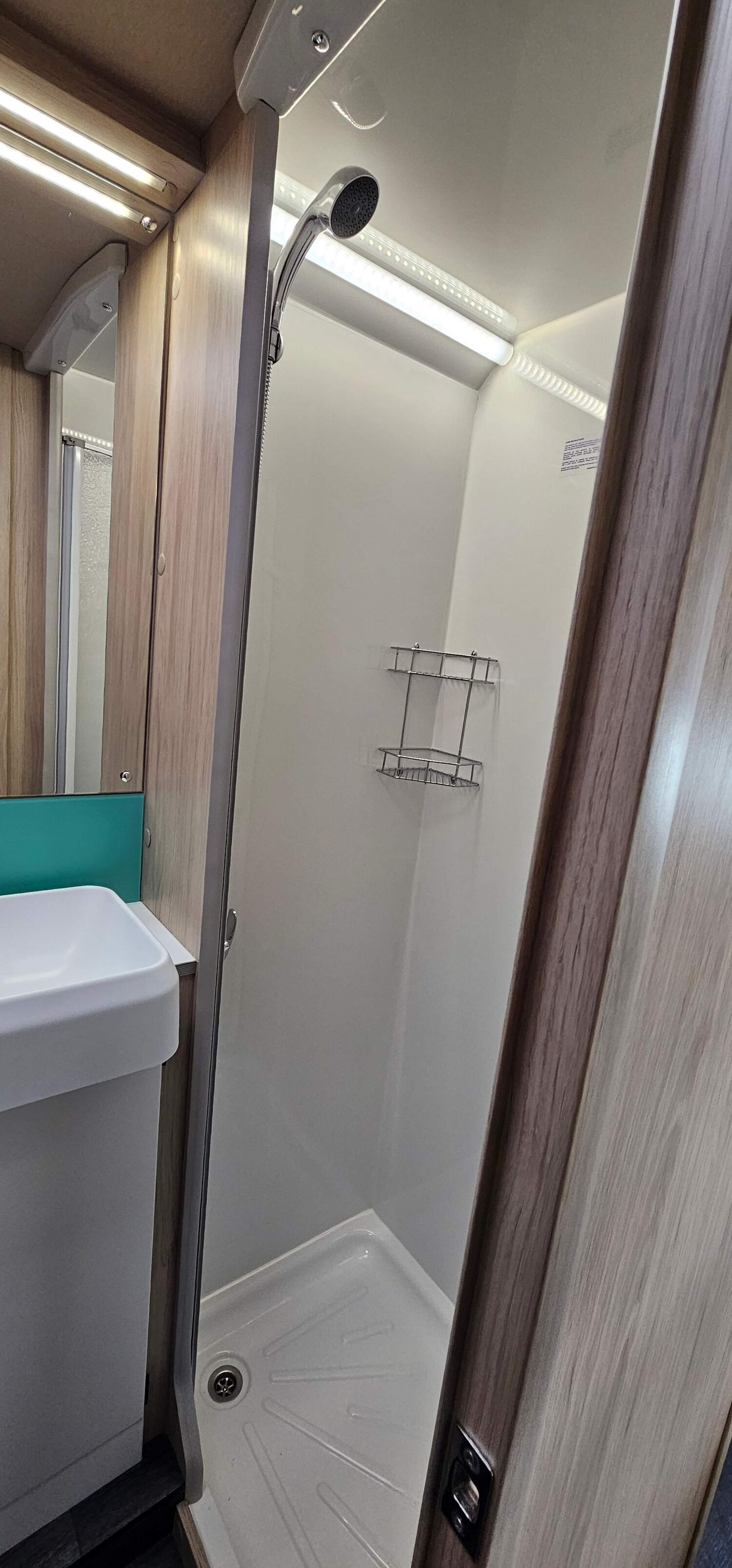 CUTLERY STORAGE, INSET SINK WITH FLUSH-FITTING GLASS LID, UNDER WORKTOP LED FEATURE LIGHTING, DOMESTIC STYLE BATHROOM TAPS AND SHOWER HEAD/CONTROLS, FULLY ENCLOSED SEAMLESS SHOWER CUBICLE, BLOWN AIR HEATING OUTLETS TO WASHROOM AREA, LARGE MIRROR,