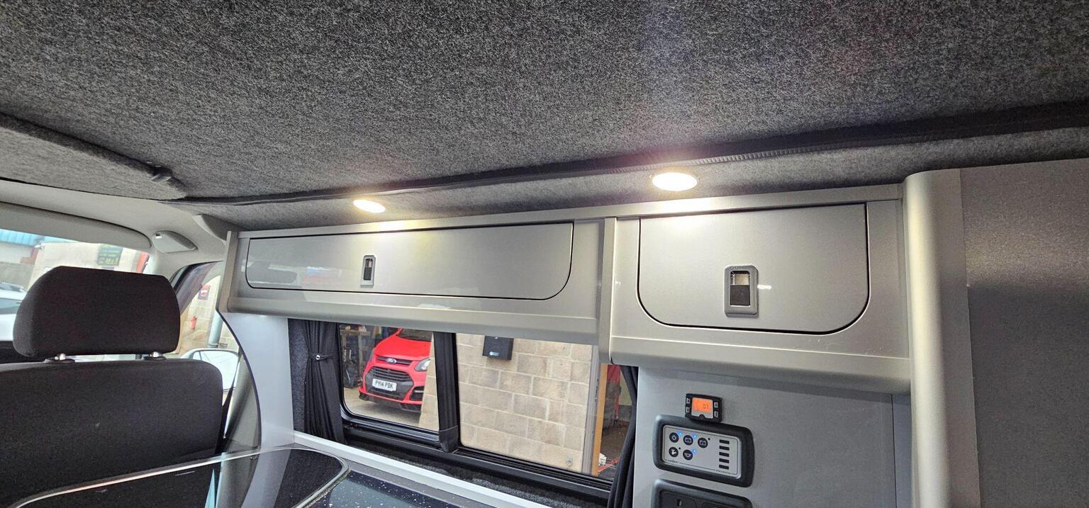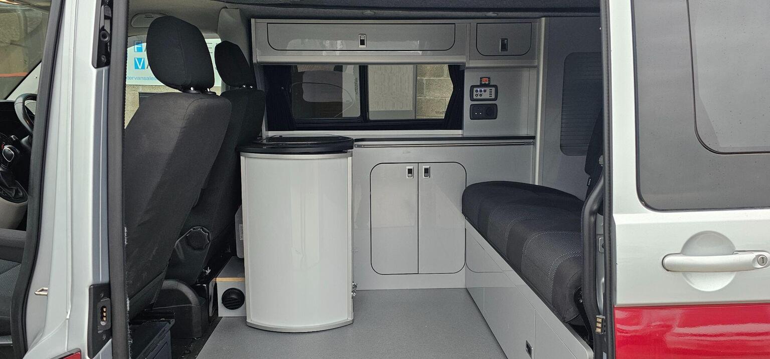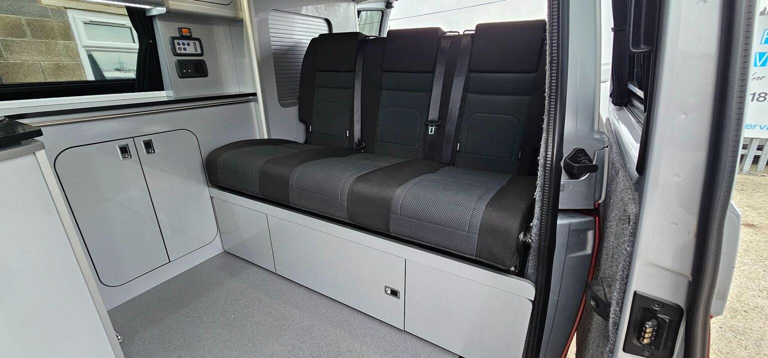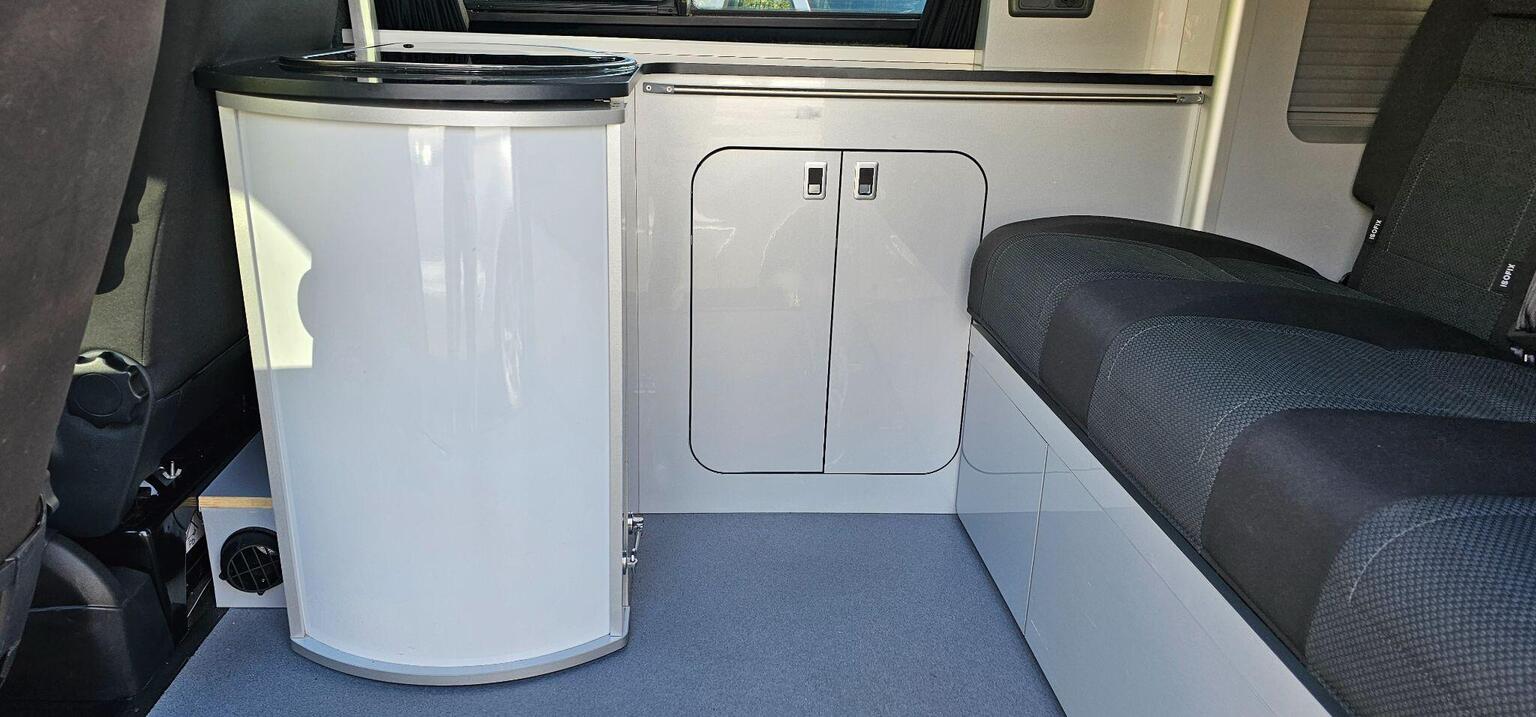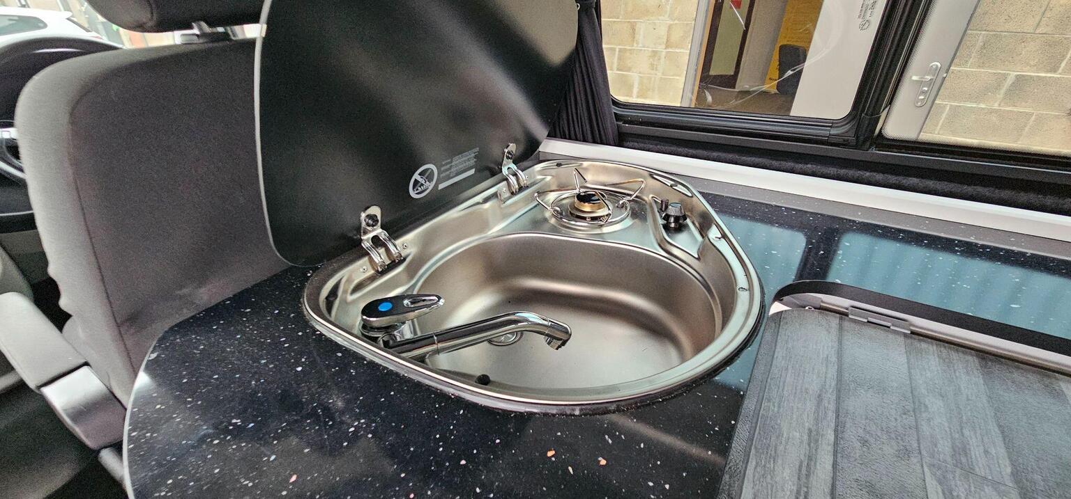 The van has a sink and hob making it fully usable as what I would call a weekender type camper although many people would utilise the drive away awning rail for longer stays away. The van has a slimline pop up roof which can be used as a bed and also gives the user additional height when using the van during the day. The roof has a Allen key type fastening which is easier to secure and more appealing then the cheaper strap type hold downs. It has multiple lighting in the van and can also be used in the colder months with its rear diesel heater. Passenger seat is swivel and there are various storage cupboards throughout, blinds over all windows. The van also benefits with a lockable safe to keep your important valuables, documents secure.