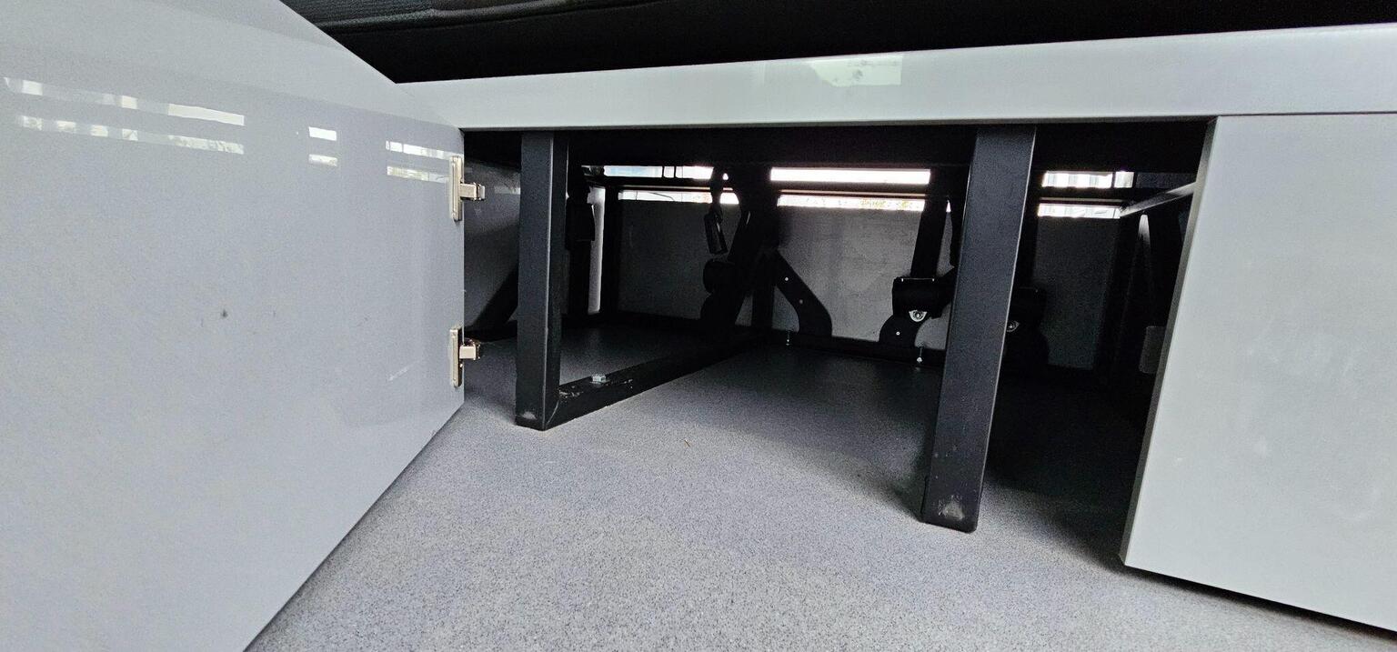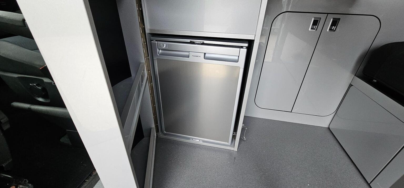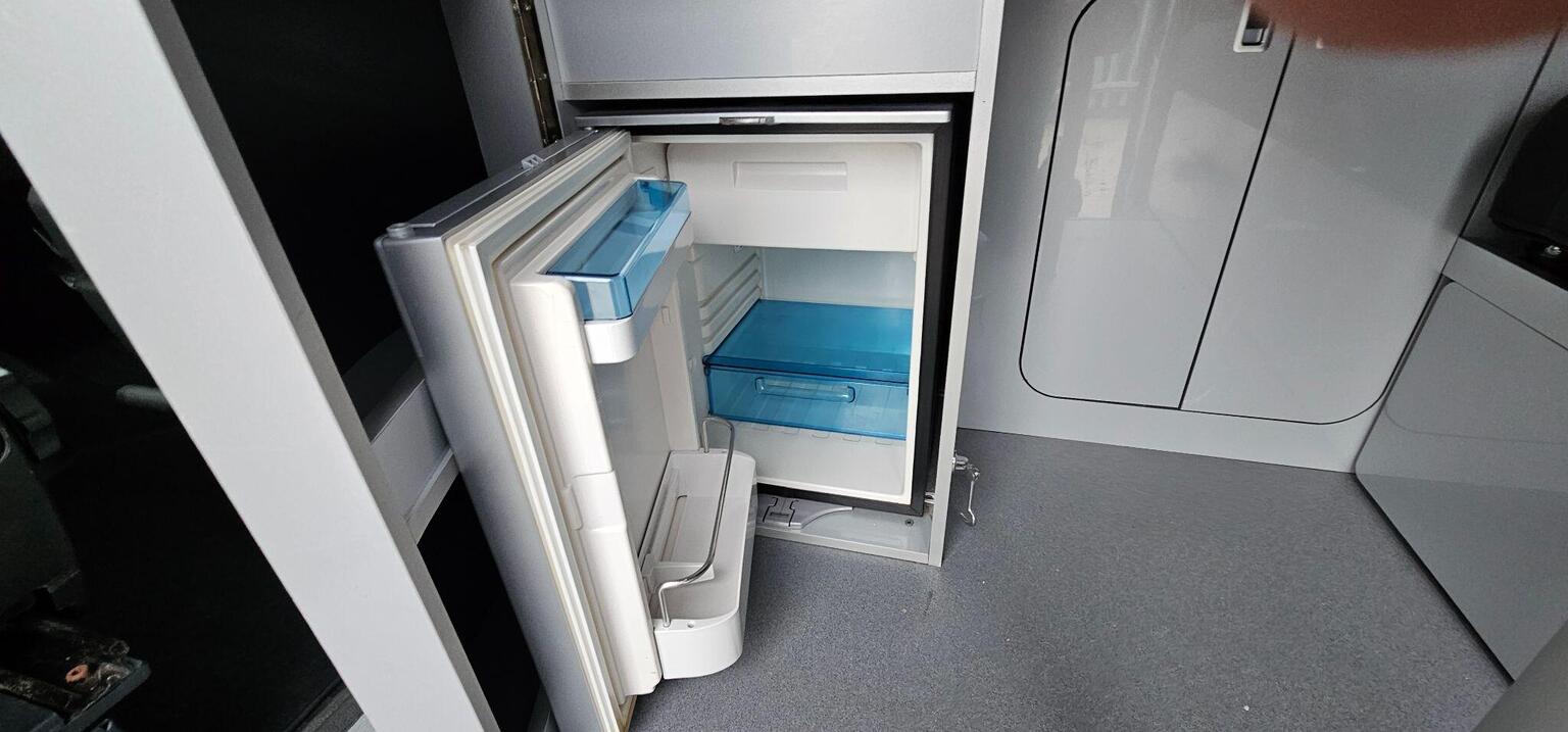 It has full rear electrics and leisure battery power controlling rear lights, water pump, fridge. Your see a unusual design layout whereby the fridge is fully hidden by a cupboard which act as a secondary fixed workspace or table but also allows the fridge to open when the bed is extended.