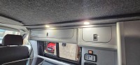 The van has a sink and hob making it fully usable as what I would call a weekender type camper although many people would utilise the drive away awning rail for longer stays away. The van has a pop up roof which can be used as a bed and also gives the user additional height when using the van during the day. The roof has a Allen key type fastening which is easier to secure and more appealing then the cheaper strap type hold downs. It has multiple lighting in the van and can also be used in the cover months with its rear diesel heater. Passenger seat is swivel and there are various storage cupboards throughout, blinds over all windows. The van also benefits with a lockable safe to keep your important valuables, documents secure.
